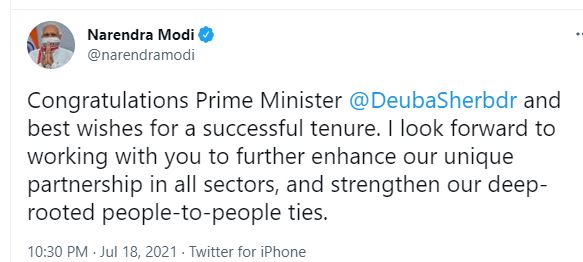 मोदीले ट्वीट गर्दै देउवाको कार्यकाल सफलताको शुभकामनासमेत दिएका छन्। उनले देउवासँग मिलेर आफूले काम गर्न चाहेकोसमेत बताएका छन्। उनले देउवाको कार्यकालमा दुई देशबीचको सम्बन्ध अझ प्रगाढ हुने र जनता जनताबीच सम्बन्ध स्थापित हुने विश्वास व्यक्त गरेका छन्।