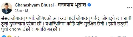तर, घनश्यामलगायतका नेताहरु भने देउवाले राखेको विश्वासको मतको प्रस्तावमा मतदान हुँदा अनुपस्थित थिए। भुसालले सामाजिक सञ्जालमा भनेका छन्, ‘संसद जोगाउनु पर्थ्यो, जोगिएको छ । अब पार्टी जोगाउनु पर्नेछ, जोगाइने छ। हामी ठूलो दुर्घटनामा परेका छौं। यथास्थितिमा कोहि पनि सुरक्षित छैनौं। हामी उठ्छौं, धुलो टक्टक्याउॅछौं र अगाडि बढ्छौं।’