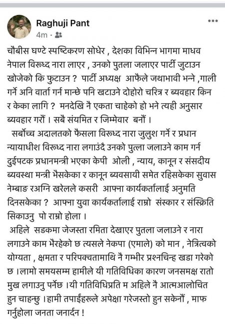 पन्तले अगाडि भनेका छन्, ‘अहिले सडकमा जेजस्ता रमिता देखाएर पुतला जलाउने र नारा लगाउने काम भैरहेको छ त्यसले नेकपा (एमाले) को मान, नेतृत्वको योग्यता , क्षमता र परिपक्वतामाथि नै गम्भीर प्रश्नचिन्ह खडा गरेको छ। लामो समयसम्म हामीले यी गतिविधिका कारण जनसमक्ष रातो मुख लगाउनु पर्नेछ। यी गतिविधिप्रति म अहिले नै आत्मआलोचित हुन चाहन्छु। हामी तपाईंहरूले अपेक्षा गरेजस्तो हुन सकेनौं , माफ गर्नुहोला जनता जनार्दन!’