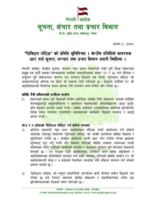 ‘कोरोना महामारी न्यून भएर महाधिवेशन भौतिक रुपमै आयोजना गर्न सकिने आशाका बाबजुद विभागले ‘डिजिटल भोटिङ’को आफ्नै आन्तरिक प्रविधि विकास र सुनिश्चित गरेको छ’ विज्ञप्तिमा भनिएको छ।