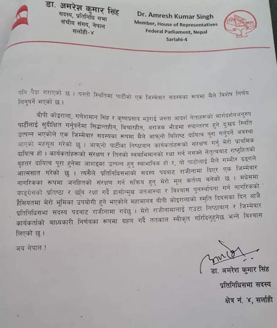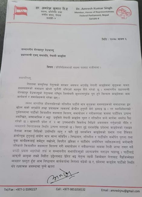 काठमाडौं। पार्टीको क्रियाशील सदस्यताको विषयमा भएको विवादपछि काँग्रेसका प्रतिनिधिसभा सदस्य अमरेश सिंहले बुधबार पदबाट राजीनामा दिएका छन्। उनले राजीनामा प्रधानमन्त्री तथा पार्टी सभापति शेरबहादुर देउवालाई बुझाएका छन्।