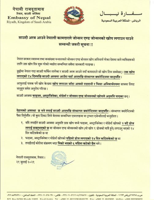 काठमाडौं । साउदी अरेबियाले कोरोनाविरुद्ध फाइजर, अस्ट्राजिनेका, मोडेर्ना र जोन्सन एण्ड जोन्सन खोपलाई मान्यता दिएको छ । रियादस्थित नेपाली दूतावासका अनुसार साउदीले मान्यता दिएको खोप लगाएका व्यक्तिहरु त्यहाँ पुगेर क्वारेन्टिनमा बस्नु पर्दैन ।