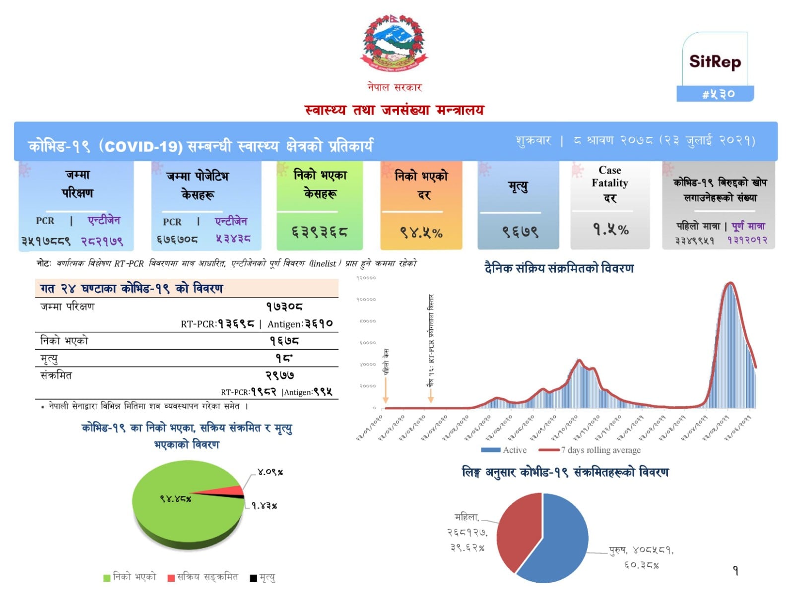 योसँगै नेपालमा कोरोना संक्रमितको संख्या ७ लाख ३० हजार १४६ पुगेको छ । जसमध्ये ६ लाख ३९ हजार ६३८ जना निको भएका छन् । पछिल्लो २४ घण्टामा १ हजार ६७८ जना निको भएका छन् । हालसम्म नेपालमा सक्रिय संक्रमितको संख्या २७ हजार ६६१ रहेको छ ।