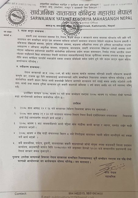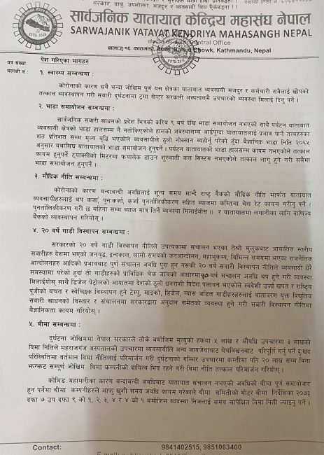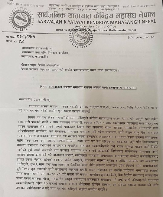 कोभिड संकटका कारण यातायात व्यवसायीहरुले भोग्नु परेको समस्या तत्काल सम्बोधन गर्न सरकारलाई दवाव दिन प्रमुख जिल्ला अधिकारीमार्फत प्रधानमन्त्री देउवालाई सार्वजनिक यातायातको साधनको साँचो बुझाउनु परेको सार्वजनिक यातायात केन्द्रीय महासंघ नेपालका अध्यक्ष होमप्रसाद अधिकारीले जानकारी दिए। उनले आफूहरुको माग अव पनि सरकारले सम्बोधन नगरे कडा आन्दोलनमा जान बाध्य हुने चेतावनी समेत दिए।