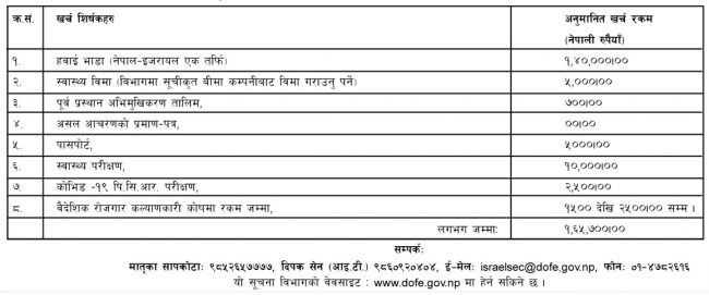 विभागको जारी गरेको सूचना अनुसार इजरायलमा रोजगारको लागि मासिक नेपाली रुपैयाँ करिब १ लाख ९३ हजार हुन्छ। इजरायल जाने कामदारको खानाको प्रबन्ध आफैले मिलाउनुपर्ने भए पनि बस्ने प्रबन्ध भने रोजगारदाताले नै गर्ने छन्। एक पटक रोजगारमा जाने करार अवधि १ बर्षको हुने भए पनि करार थपिएर ५ बर्षसम्म बस्न पाइनेछ।