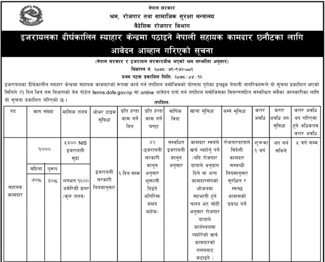 रोजगारीमा जान चाहनेले विभागको वेवसाइटमा गएर अनलाइन फाराम भर्नका लागि आग्रह गरिएको छ। सरकारी संयन्त्र (जीटुजी)मार्फत इजरायलमा कामदार पठाउने सम्झौता भए अनुसार विभागले औपचारिक रुपमा आवेदन खुल्ला गरेको हो । विभागका अनुसार इजरायलले सुसारे (केयरगिभर) कामका लागि एक हजार नेपाली श्रमिक लैजाने छ।