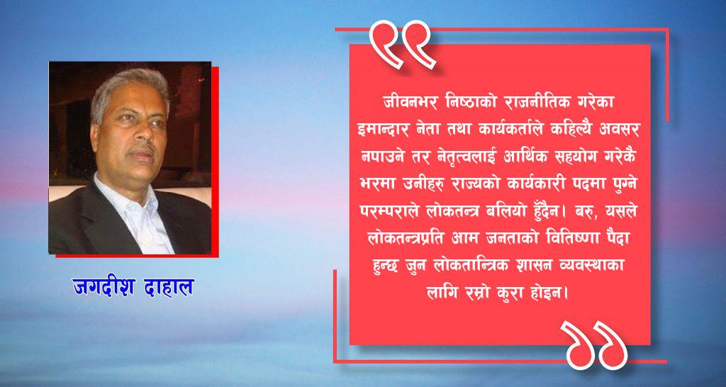 जीवनभर निष्ठाको राजनीतिक गरेका इमान्दार नेता तथा कार्यकर्ताले कहिल्यै अवसर नपाउने तर नेतृत्वलाई आर्थिक सहयोग गरेकै भरमा उनीहरु राज्यको कार्यकारी पदमा पुग्ने परम्पराले लोकतन्त्र बलियो हुँदैन। बरु, यसले लोकतन्त्रप्रति आम जनताको वितिष्णा पैदा हुन्छ जुन लोकतान्त्रिक शासन व्यवस्थाका लागि रम्रो कुरा होइन।