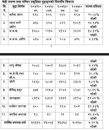 प्रहरीका अनुसार गत आर्थिक वर्षमा ४०,१२० वटा अपराधका घटनाहरू दर्ता भएका छन्। प्रति दिन ११० वटा अपराधका घटनाहरू दर्ता भएको प्रहरीले जनाएको छ। आवमा अघिल्लो आवभन्दा ४.२४ प्रतिशतले अपराधमा कमी आएको प्रहरीको तथ्यांकले देखाएको छ।