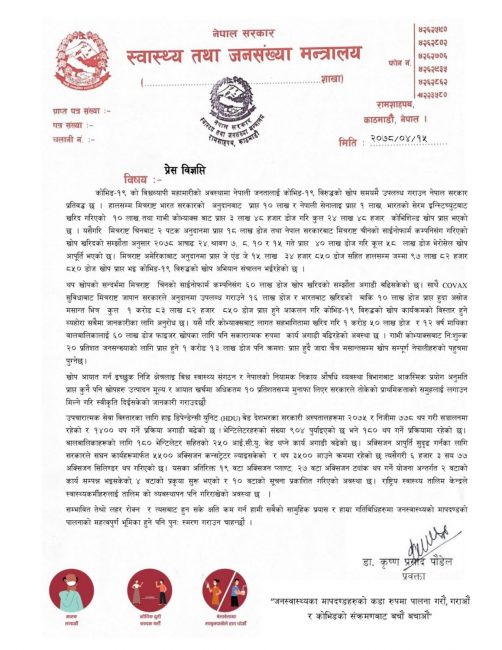 चीनको साइनोफार्म कम्पनीबाट थप ६० लाख डोज भेरोसेल खोप खरिद प्रक्रिया अघि बढेको, जापानबाट आउने १६ लाख डोज अस्ट्राजेनेका र भारतबाट आउने १० लाख कोभिसिल्डसहित असोज मसान्तभित्र १ करोड ८३ लाख ८२ हजार डोज डोज खोप प्राप्त हुने समेत मन्त्रालयले जनाएको छ ।