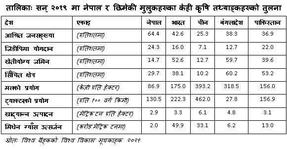 विश्व बैङ्कको तथ्याङ्क अनुसार सन् २०१९ मा नेपाल र छिमेकी मुलुकहरू (भारत, चीन, बाङ्लादेश र पाकिस्तान) का केही कृषि तथ्याङ्कहरूको तुलना तालिकामा प्रस्तुत गरिएको छ। यस तथ्याङ्क अनुसार नेपालमा कृषिमा आश्रित जनसङ्ख्या कुल जनसङ्ख्याको ६४.४ प्रतिशत छ।