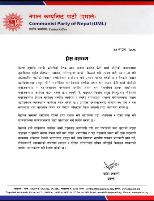 एमालेको विधान महाधिवेशन भदौ २७ र २८ मा हुने
