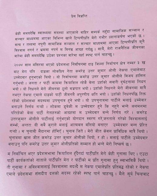 तर, सोमबार उनले विज्ञप्ति जारी आफू एमालेमै रहेको जानकारी गराएकी हुन्। लुम्बिनी प्रदेशमा जारी राजनीतिक उटाङपटाङकाबीच उनले आफू एमालेमै रहेको बताएपछि एमाले नेता शंकर पोखरेल नेतृत्वको सरकारले जीवनदान पाउने सम्भावना बढेको छ। हाल ८० सदस्यीय रहेको प्रदेशसभामा विपक्षी गठबन्धनसँग पनि अब ४० जनामात्र सांसद रहेकाले कुनै पनि पक्ष स्पष्ट बहुमतमा नहुने देखिएका हुन्।