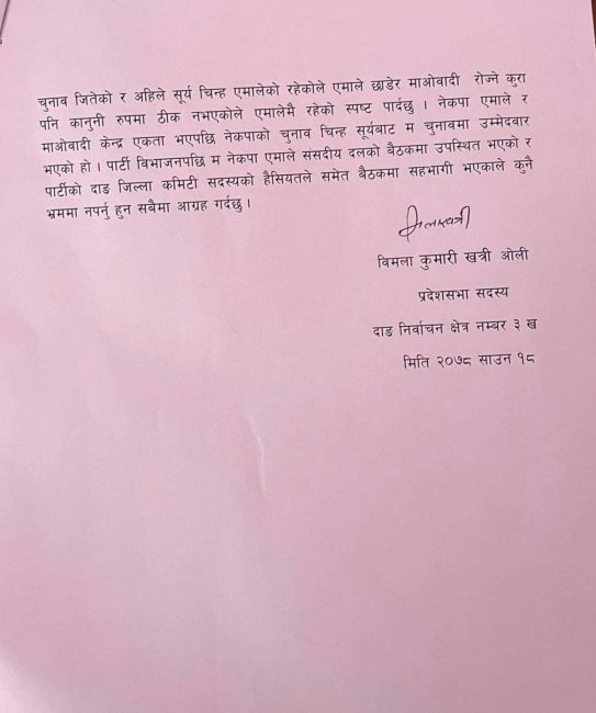 लुम्बिनी प्रदेशकी सांसद विमला खत्री एमालमै फर्किइन् (विज्ञप्तिसहित)