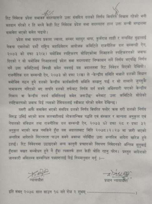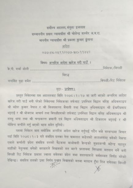 तर, सर्वोच्च अदालतले अन्तरिम आदेश दिँदै सो कारबाही कार्यान्वयन नगर्न भन्दै उनीहरुको पदबहाली गरेपछि एमाले अध्यक्ष केपी शर्मा ओलीले सर्वोच्चमा भ्याकेट निवेदन दिएका थिए।