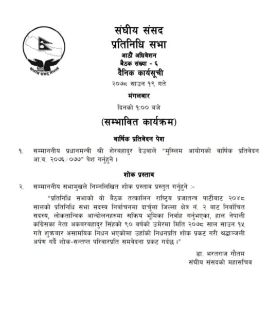 दोस्रो कार्यसूचीमा तत्कालिन राष्ट्रिय प्रजातन्त्र पार्टीबाट २०४८ सालको प्रतिनिधि सभा सदस्य निर्वाचनमा दार्चुला क्षेत्र नम्बर २ बाट निर्वाचित सदस्य अकबरबहादुर बहादुर सिंहको निधनमा शोक प्रस्ताव पारित गर्ने रहेको सचिवालले जारी गरेको सूचनामा उल्लेख छ।