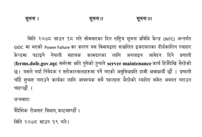 विभागले राष्ट्रिय सूचना प्रविधि केन्द्र(एनआईटीसी) अन्तर्गत ‘जीआईडीसी’मा भएको पावर फेलियरका कारण अनलाइन फारम भर्ने प्रणाली (ferms.dofe.gov.np) सर्भरमा समस्या आएको जनाएको छ । साथै, प्रणाली चाँडै सुचारु हुने जानकारी गराइएको छ ।
