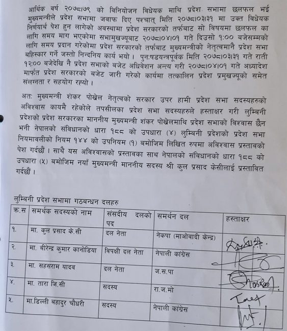 लुम्बिनीका मुख्यमन्त्री शंकर पोखरेलविरुद्ध अविश्वास प्रस्ताव दर्ता
