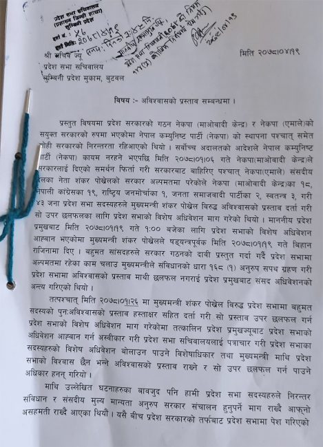 विपक्षी नेपाली कांग्रेस, नेकपा माओवादी केन्द्र, जनता समाजवादी पार्टी र राष्ट्रिय जनमोर्चाका सांसदले मंगलबार दिउँसो प्रदेशसभा सचिवालयमा अविश्वासको प्रस्ताव दर्ता गराएका हुन् ।