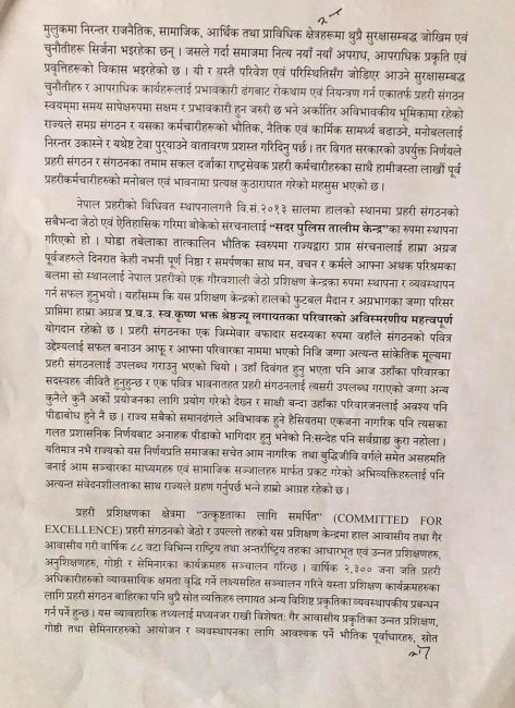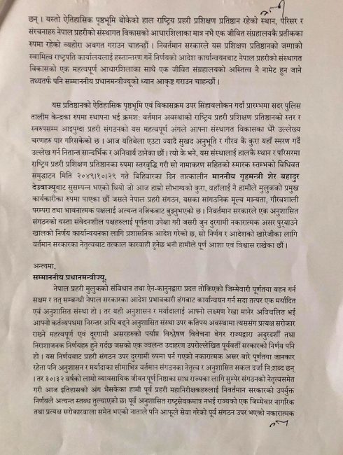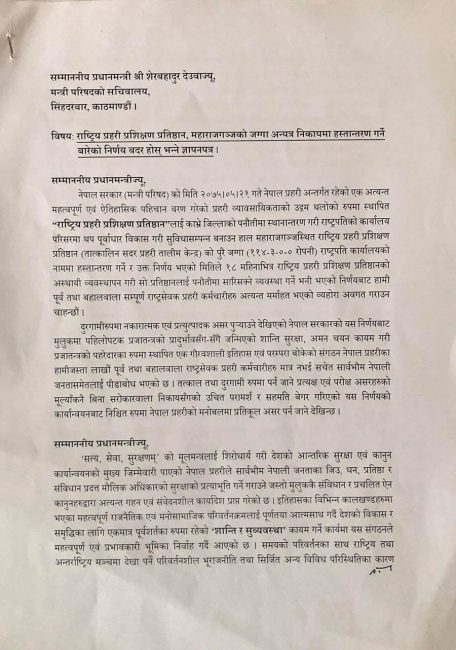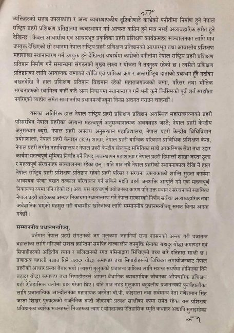 प्रहरीको एकेडेमी सार्ने ओली सरकारको निर्णय फिर्ता लिन प्रधानमन्त्रीलाई १५ पूर्वआईजीपीको आग्रह