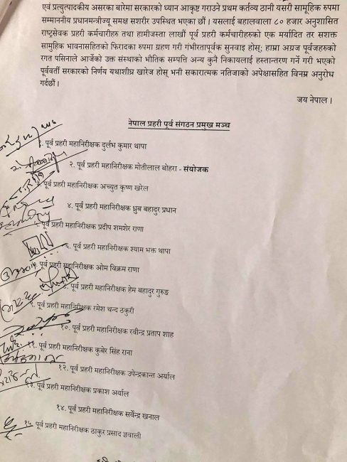 पूर्वआईजीपीहरु मोतिलला बोहोरा, अच्युतकृष्ण खरेल, ध्रुबबहादुर प्रधान, प्रदीप शमशेर राणा, श्यामभक्त थापा, ओमविक्रम राणा, हेम गुरुङ, रमेश चन्द ठकुरी, रवीन्द्र प्रताप शाह, कुबेरसिंह राना, उपेन्द्र कान्त अर्याल, प्रकाश अर्याल, सवेन्द्र खनाल र ठाकुरप्रसाद ज्ञवालीले बुधबार प्रधानमन्त्री देउवालाई भेटेर ज्ञापन पत्र बुझाएका हुन्।