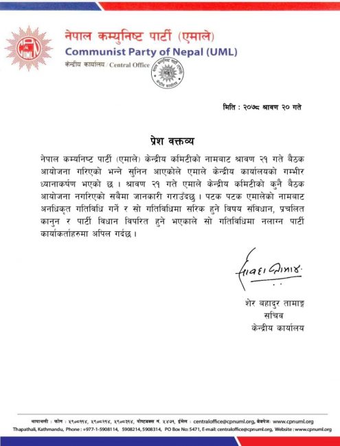 एमाले केन्द्रीय कार्यालयका सचिब शेरबहादुर तामाङले बुधबार विज्ञप्ति जारी गर्दै एमाले केन्द्रीय कमिटीको बैठक नबोलाइएको बताएका छन्। उनले एमालेको नाममा पटक पटक अनाधिकृत बैठक बोलाइएको भन्दै त्यस्ता बैठक पार्टीको विधानविपरित रहेकोसमेत बताएका छन्। उनले यस्ता अनाधिकृत बैठकमा सहभागी नहुन आग्रह गरेका छन्।