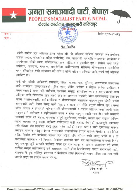 काठमाडौं। जनता समाजवादी पार्टी (जसपा)का अध्यक्ष उपेन्द्र यादवले पार्टी एकताको पक्षमा उभिन नेता कार्यकर्तालाई आव्हान गरेका छन्। विहीबार एक विज्ञप्ति जारी गर्दै उनले पार्टी एकताको पक्षमा उभिएर पार्टीलाई बलियो बनाउन भनेका छन्।