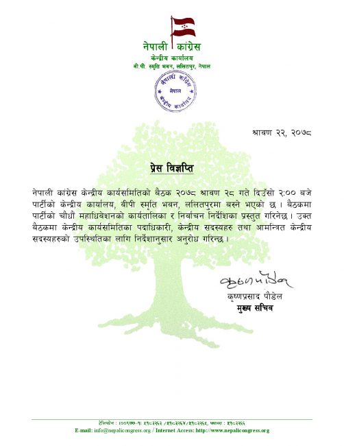 पार्टी केन्द्रीय कार्यालयका मुख्य सचिब कृष्ण प्रसाद पौडेले साउन २८ गतेका लागि बैठक बोलाइएको जानकारी दिए। उनका अनुसार महाधिवेशनको कार्यतालिका र निर्वाचन निर्देशिका बैठकका मुख्य एजेण्डा हुन्।