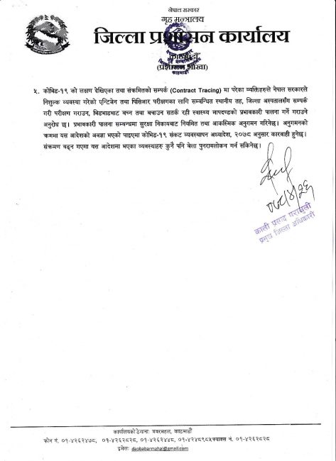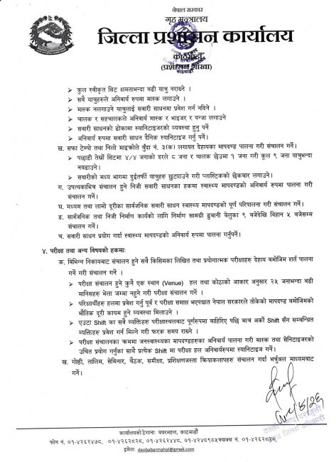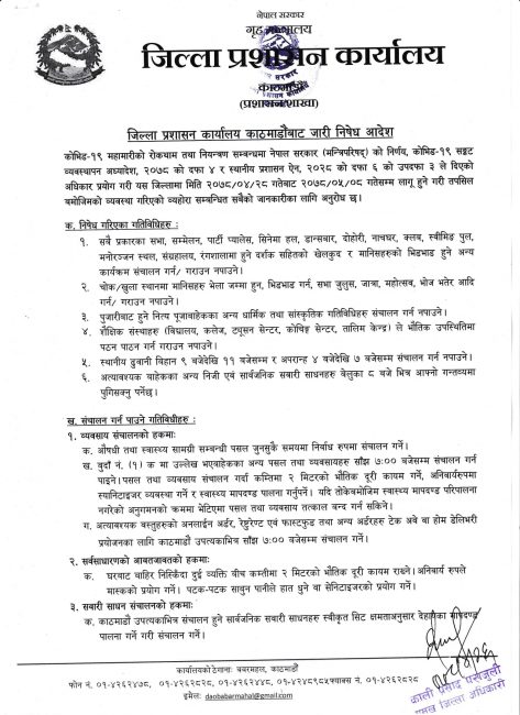 त्यस्तै काठमाडौं उपत्यकाभित्र भदौ ८ गतेसम्मको लागि निषेधाज्ञा थप भएको छ। वैशाख १६ गतेदेखि काठमाडौं उपत्यकाभित्र निषेधाज्ञा जारी छ।