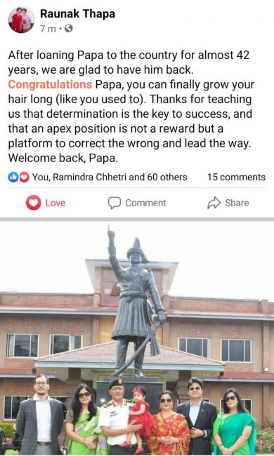 काठमाडौं । प्रधानसेनापति पूर्णचन्द्र थापाले सेवाबाट अवकाशपूर्व बिदा बसेसँगै थापाका छोरा रौनक थापाले भावुक स्टाटस लेखेका छन् ।