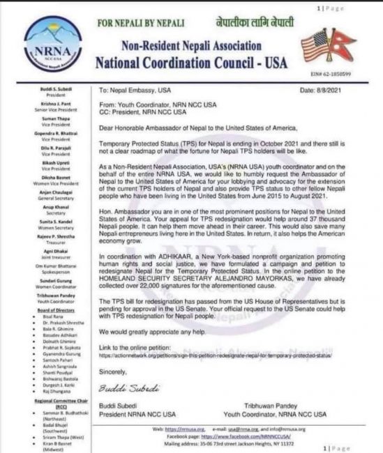 एनआरएनएले सार्वजानिक गरेको राजदूत खतिवडालाई लेखेको पत्रमा अमेरिकी अध्यागमन विभागले नेपालीसहित केही देशमा नागरिकहरुलाई दिँदै आएको टेम्पोरेरी प्रोटेक्टेड स्ट्याटस (टिपिएस) बारे उल्लेख गरिएको थियो।