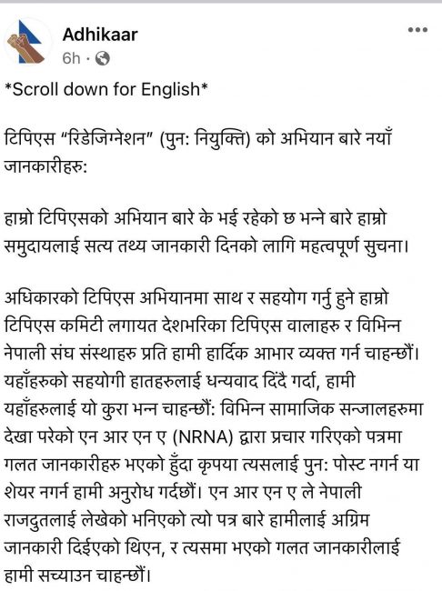 यसलाई स्पष्ट पार्दै अधिकारले आफ्नो फेसबुक पेजमा लेखेको छ, ‘विभिन्न सामाजिक सन्जालहरुमा देखा परेको एन आर एन ए (NRNa) द्वारा प्रचार गरिएको पत्रमा गलत जानकारीहरु भएको हुँदा कृपया त्यसलाई पुनस् पोस्ट नगर्न या शेयर नगर्न हामी अनुरोध गर्दछौं। एन आर एन ए ले नेपाली राजदुतलाई लेखेको भनिएको त्यो पत्र बारे हामीलाई अग्रिम जानकारी दिइएको थिएन, र त्यसमा भएको गलत जानकारीलाई हामी सच्याउन चाहन्छौं।  सो पत्रमा भनिए जस्तो हाम्रो टिपिएसको “रिडेजिग्नेशन” को अभियान विधेयक (बिल) होइन। यो हामीले डिपार्टमेन्ट अफ होमल्यान्ड सेक्यूरिटी (DHs) संग सिधै गरि रहेको वकालत हो। यस अभियानमा नेपाली राजदुतको समर्थन लाभदायी नै हुने भएता पनि, “रिडेजिग्नेशन” को अभियानमा म्ज्क् को सेक्रेटेरीले प्रमुख निर्णायक भूमिका खेल्ने हुनाले हाम्रो ध्यान वहाँ प्रति नै केन्द्रित छ। “रिडेजिग्नेशन” टिपिएस नविकरण भन्दा फरक छ। “रिडेजिग्नेशन”ले २०१५ भन्दा पछि अमेरिका आएका नेपालीहरुलाई पनि टिपिएसको लागि योग्य बनाउने हुँदा यसले थप नेपालीहरुलाई टिपिएसको लागि आवेदन दिन अवसर दिन्छ।’