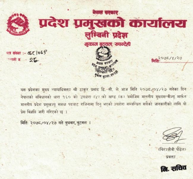 लुम्बिनीका मुख्यन्यायाधिवक्ता डिसीद्वारा राजीनामा