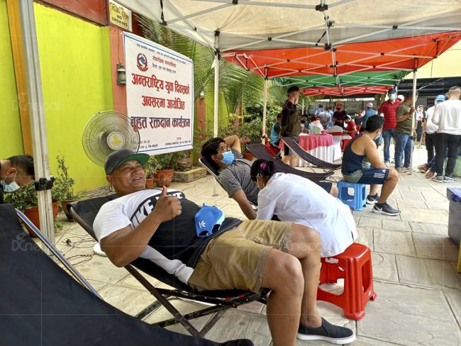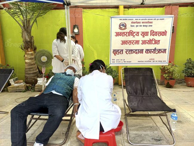 काठमाडौं। गोकर्णेश्वर नगरपालिका, युवा तथा खेलकुद शाखाले गोकर्णेश्वर नगरपालिका–५ स्थित पिस ब्याङ्केटमा वृहत रक्तदान कार्यक्रम गरेको छ। अन्तर्राष्ट्रिय युवा दिवसको अवसर पारेर उक्त शाखाले आज (बिहिबार) वृहत रक्तदान कार्यक्रमको आयोजना गरेको हो।