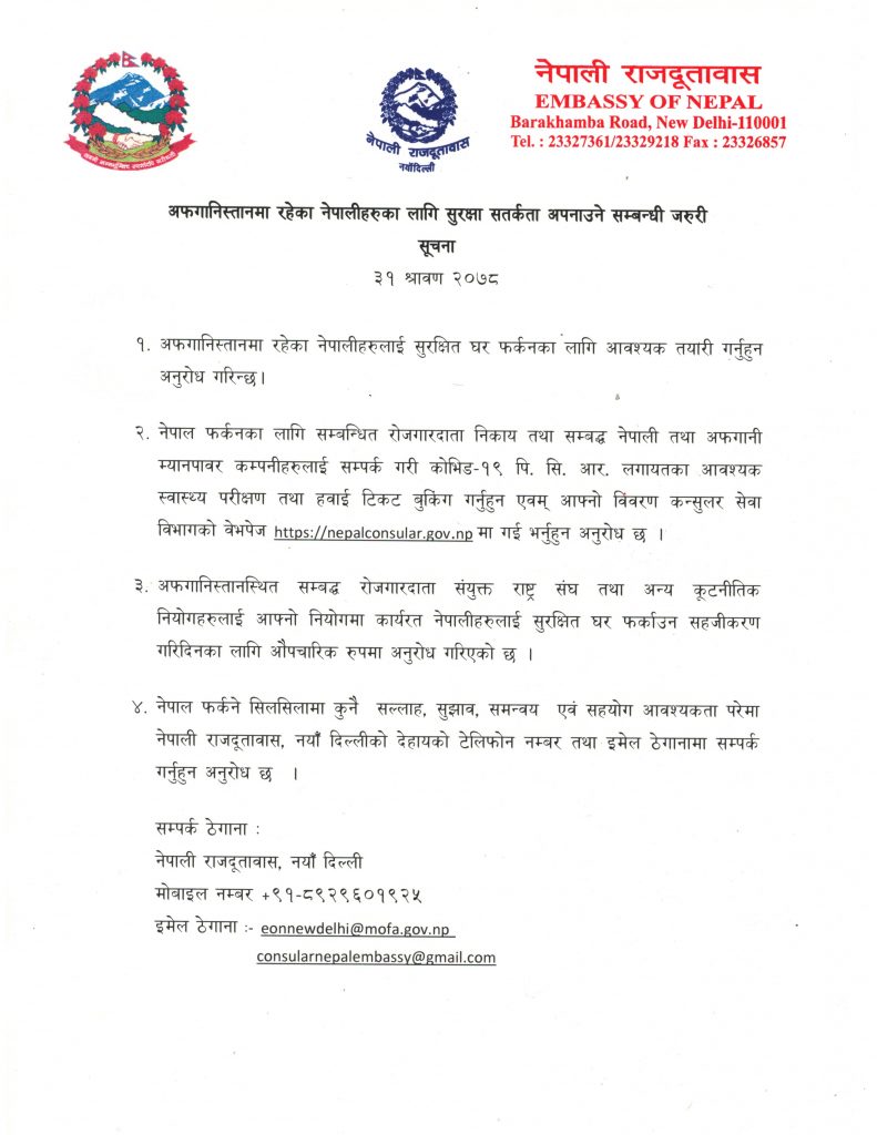 दुतावासले एक सुचना जारी गर्दै अब अफगानिस्तानमा रहेका नेपाली नागरिकले स्वास्थ्य परिक्षण तथा टिकट बुकिङ लगायतका तयारी गर्न आग्रह गरेको हो । उनीहरुले कन्सुलर सेवा विभागको वेबसाइटमा आफ्नो नामसहितको विवरण समावेश गर्न पनि दुतावासले भनेको छ ।