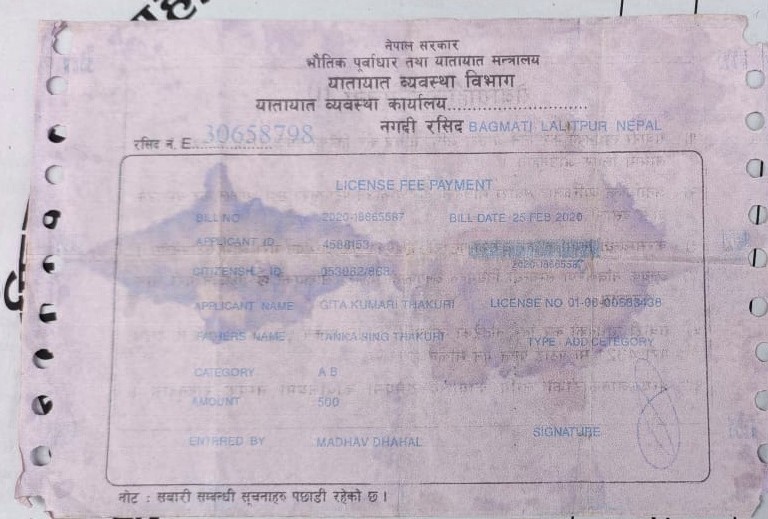 यातायात कार्यालयहरूबाट जारी गरिने सवारी चालक अनुमतिपत्रका नगदी रसिदहरू केही व्यक्तिहरुले सरकारी कागजात दस्तखत किर्ते गरी रकम लिने गरेको भन्ने बिशेष सूचनाका आधारमा ट्राफिक प्रहरीले उनीहरूलाई कागेश्वरी मनोहरा नगरपालिका वडा नं ६ मुलपानीस्थित राईजिङ एक्सपोर्ट ड्राईभिङ सेन्टरबाट पक्राउ गरेको ट्राफिक महाशाखाका प्रमुख एसएसपी जनक भट्टराईले जानकारी दिए ।