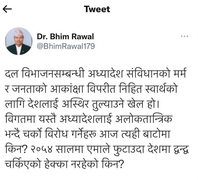 नेकपा एमालेका अध्यक्ष केपी ओली प्रधानमन्त्री हुँदा त्यतिबेला उपेन्द्र यादवको दल विभाजनका लागि अध्यादेश ल्याउँदा नेपाली कांग्रेस र अरु सबै विपक्षी दलहरु तथा सत्तारुढ नेकपामा पुष्पकमल दाहाल प्रचण्ड र माधव नेपालसमूहका सबै नेता कार्यकर्ताहरुले अलोकतान्त्रिक कदम भन्दै चर्को विरोध गरेका थिए । यो प्रसंगलाई समेत उल्लेख गर्दै नेता रावलले लेखेका छन्,“दल विभाजनसम्बन्धी अध्यादेश संविधानको मर्म र जनताको आकांक्षा विपरीत निहित स्वार्थको लागि देशलाई अस्थिर तुल्याउने खेल हो । विगतमा यस्तै अध्यादेशलाई अलोकतान्त्रिक भन्दै चर्को विरोध गर्नेहरु आज त्यही बाटोमा किन ? २०५४ सालमा एमाले फुटाउँदा देशमा द्वन्द्व चर्किएको हेक्का नरहेको किन ?”