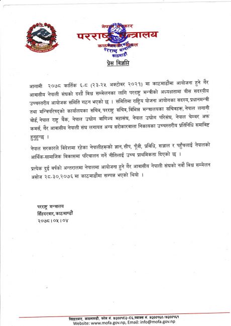 परराष्ट्रद्वारा एनआरएनएको १०औँ विश्व सम्मेलनका लागि आयोजक समिति गठन