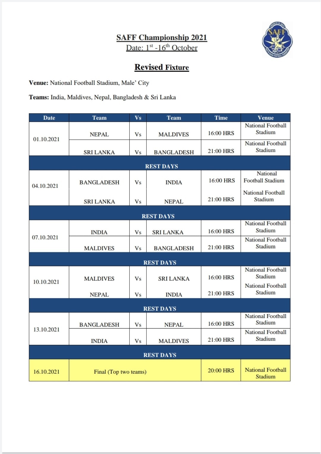 दक्षिण एसियाली फुटबल महासंघ (साफ) ले शनिबार यस अघि निकालेको तालिका परिवर्तन गर्दै नयाँ तालिका सार्वजनिक गरेको छ ।