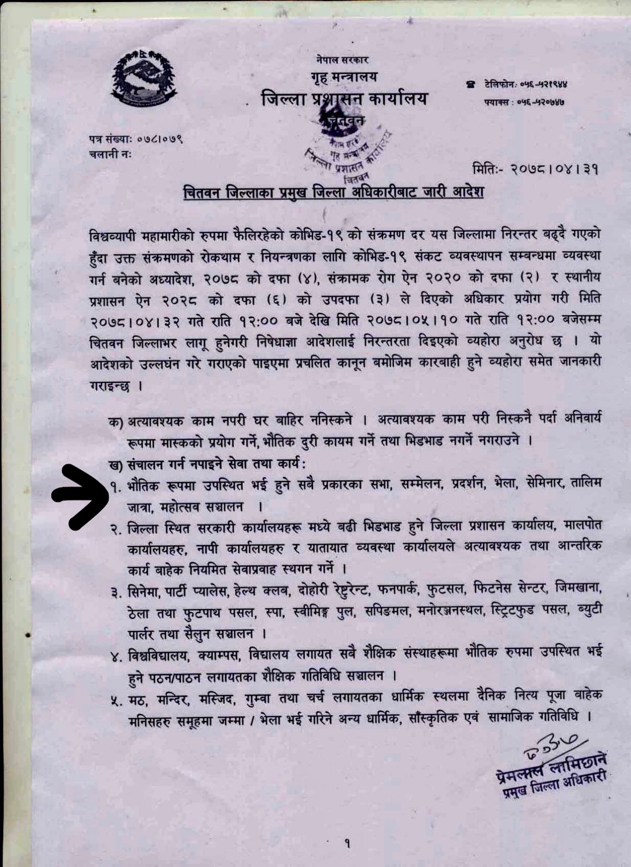 साउन ३१ गते उनी आफैँले हस्ताक्षर गरेर जारी गरेको आदेशमा संचालन गर्न नपाइने सेवा र कार्यमध्ये “भौतिक रुपमा उपस्थित भई हुने सबै प्रकारका सभा, सम्मलेन , प्रदर्शन ,भेला ,सेमिनार ,तालिम , जात्रा र महोत्सब संचालन” भनी उल्लेख छन्। सिडियोको आदेशमा “यी आदेशहरुको पालना नगरेको पाइएमा प्रचलित कानुनबमोजिम कारबाही हुने समेत जानकारी गराइएको भए पनि जिल्ला प्रमुख आफैले सो नियम तोडेका छन्।