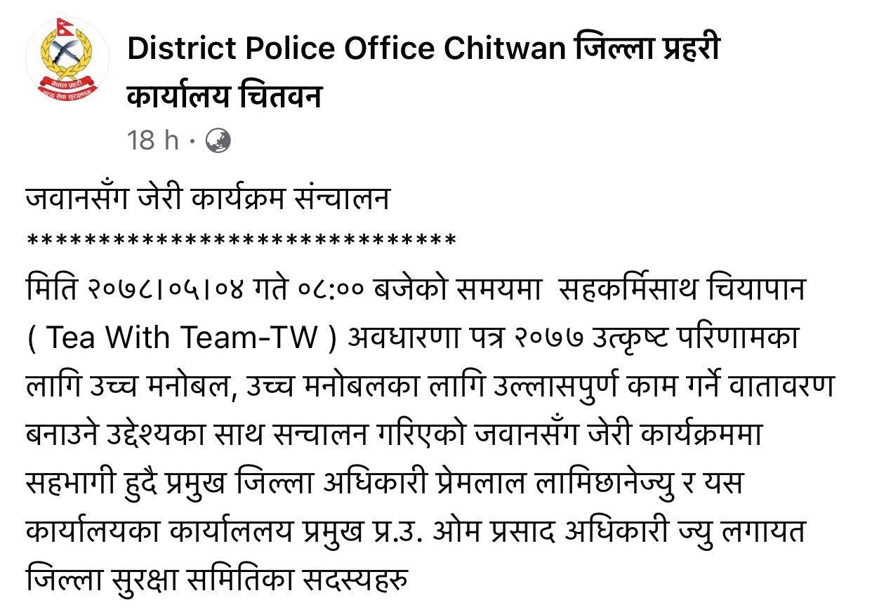 जिल्ला प्रहरी कार्यालय चितवनले शुक्रबार आफ्नो फेसबुक पेजमा पोस्ट गर्दै यस्तो लेखेको छः