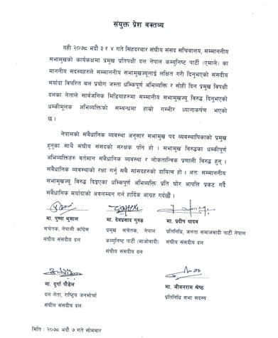 ती दलका तर्फबाट आज जारी गरिएको संयुक्त विज्ञप्तिमा सभामुखको कार्यकक्षमा प्रमुख प्रतिपक्षी दल एमालेका सांसदले सभामुखलाई लक्षित गरी दिएको संसदीय मर्यादाविपरीत बल प्रयोग जस्ता धम्कीपूर्ण अभिव्यक्ति र सोही दिन प्रमुख विपक्षी दलका नेताले सार्वजनिकरुपमा सञ्चारमाध्यमममा दिएको धम्कीमूलक अभिव्यक्तिप्रति आफूहरुको गम्भीर ध्यानाकर्षण भएको उल्लेख छ।