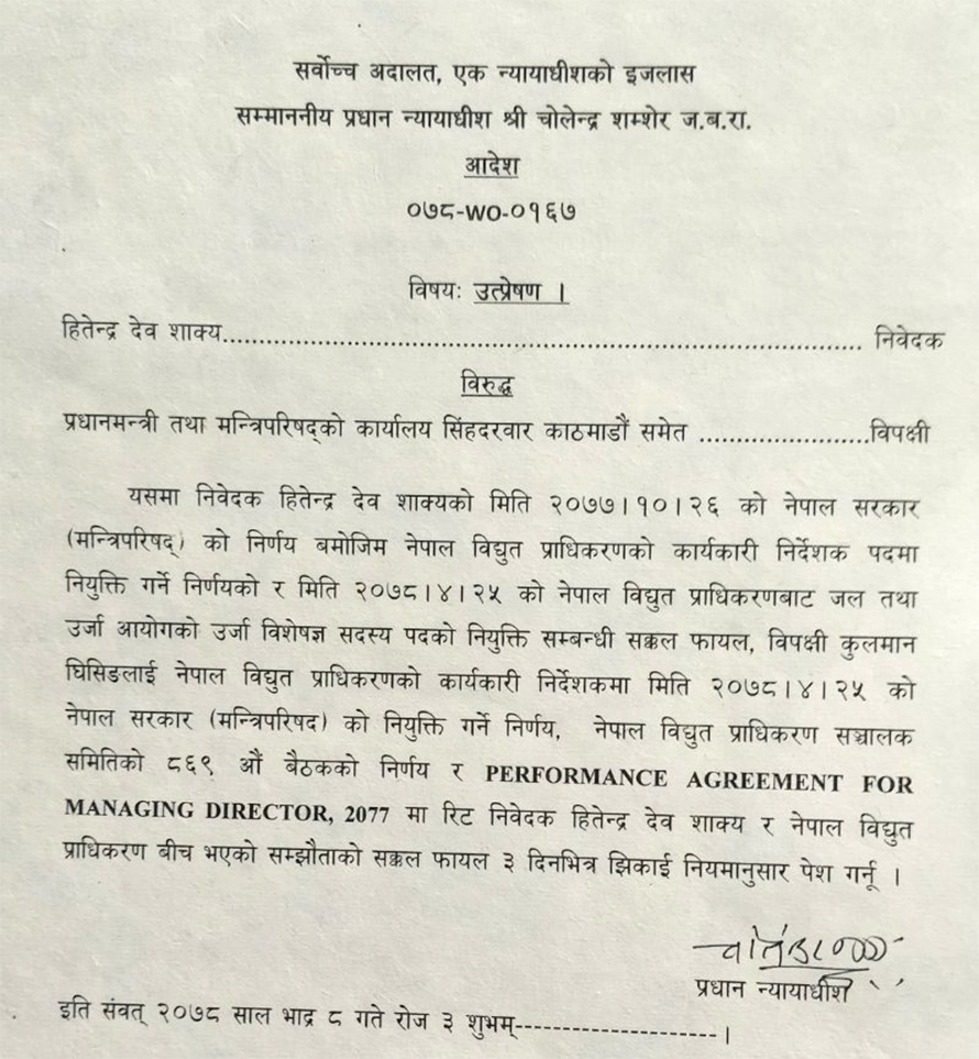 प्रधानन्यायाधीश चोलेन्द्रशमशेर जबराको एकल इजलासले कुलमान घिसिङको नियुक्तिसम्बन्धी निर्णय झिकाउन आदेश दिएको हो । इजलासले २०७७ पुस २६ गते हितेन्द्र देव शाक्यलाई प्राधिकरणको कार्यकारी निर्देशकमा गरेको नियुक्ति, शाक्यलाई जल तथा ऊर्जा आयोगको ऊर्जा विशेषज्ञमा गरिएको नियुक्ति र विद्युत प्राधिकरण सञ्चालक समितिले शाक्यसँग गरेको कार्यसम्पादन सम्झौता र २०७८ साउन २५ गते प्राधिकरणको कार्यकारी निर्देशकमा भएको कुलमानको नियुक्तिको सक्कल निर्णय ३ दिनभित्र मगाउन आदेश दिएको हो ।