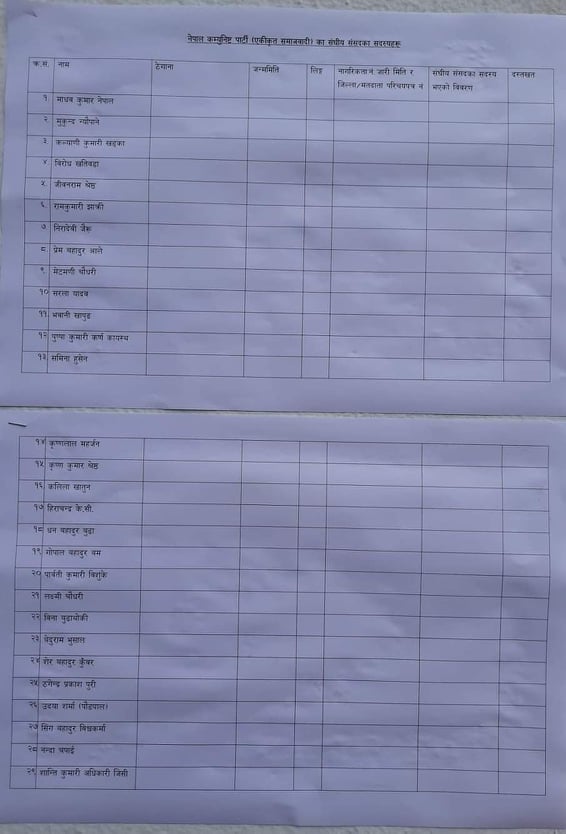 माधव नेपाल नेतृत्वको नयाँ दल दर्तामा एमालेका प्रतिनिधि सभा र राष्ट्रिय सभा गरी ३० सांसदको हस्ताक्षर सनाखत भएको हो । जसमा प्रतिनिधिसभाका माधवकुमार नेपाल, मुकुन्द न्यौपाने, कल्याणीकुमारी खड्का, विरोध खतिवडा, जीवनराम श्रेष्ठ, रामकुमारी झाँक्री, निरादेवी जैरु, प्रेमबहादुर आले, मेटमणि चौधरी, सरला यादव, भवानी खापुङ, पुष्पाकुमारी कर्ण कायस्थ, समिना हुसेन, कृष्णलाल महर्जन, कृष्णकुमार श्रेष्ठ, कलिला खातुन, हिराभन्द्र केसी, धनबहादुर बुढा, गोपालबहादुर बम, पार्वतीकुमारी विशुंके, लक्ष्मी चौधरी र विना बुढाथोकी रहेका छन् ।