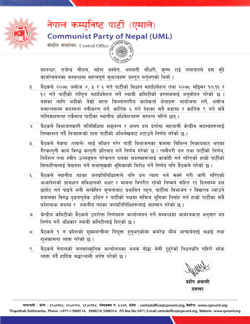 पार्टी प्रवक्ता प्रदीप ज्ञवालीले जारी गरेको विज्ञप्तिमा नयाँ पार्टीमा लाग्ने केन्द्रीय सदस्यहरुलाई निष्कासन गर्ने निर्णय गर्दै पार्टीको अभिलेखबाट उनीहरुको नाम हटाउने निर्णय गरेको उल्लेख छ ।
