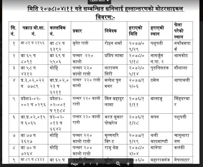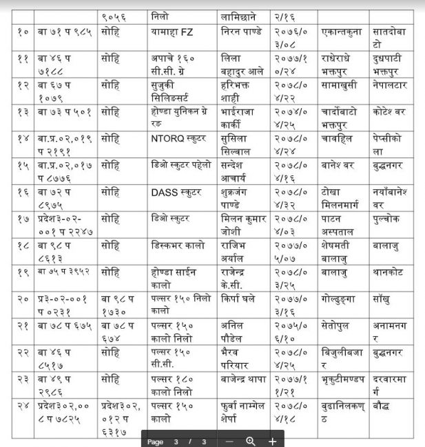 रोहन शर्मा, प्रदिप लामा, नारायण गिरी, सन्देश पुन मगर, मिन बहादुर लामा, भरत कुमार पोखरेल, कृष्णगरि बिष्ट, राजु श्रेष्ठ, सुरेश लामिछाने, निरन पाण्डे, लिला बहादुर आले, हरिभक्त शाही, भाईराजा कार्की, सुसिला सिलवाल, सन्देश आचार्य, शुक्रजंग पाण्डे, मिलन कुमार जोशी, राजिभ अर्याल, राजेन्द्र के.सी., किर्पा घले, अनिल पौडेल, भैरव परियार, बाजेन्द्र थापा र फुर्वा नाम्गेल शेर्पाको मोटरसाइकलहरू यस महाशाखाको पीडित सहायता ईकाईबाट खटिएको ट्राफिक प्रहरी टोलीले खोजतलास गरेको हो।