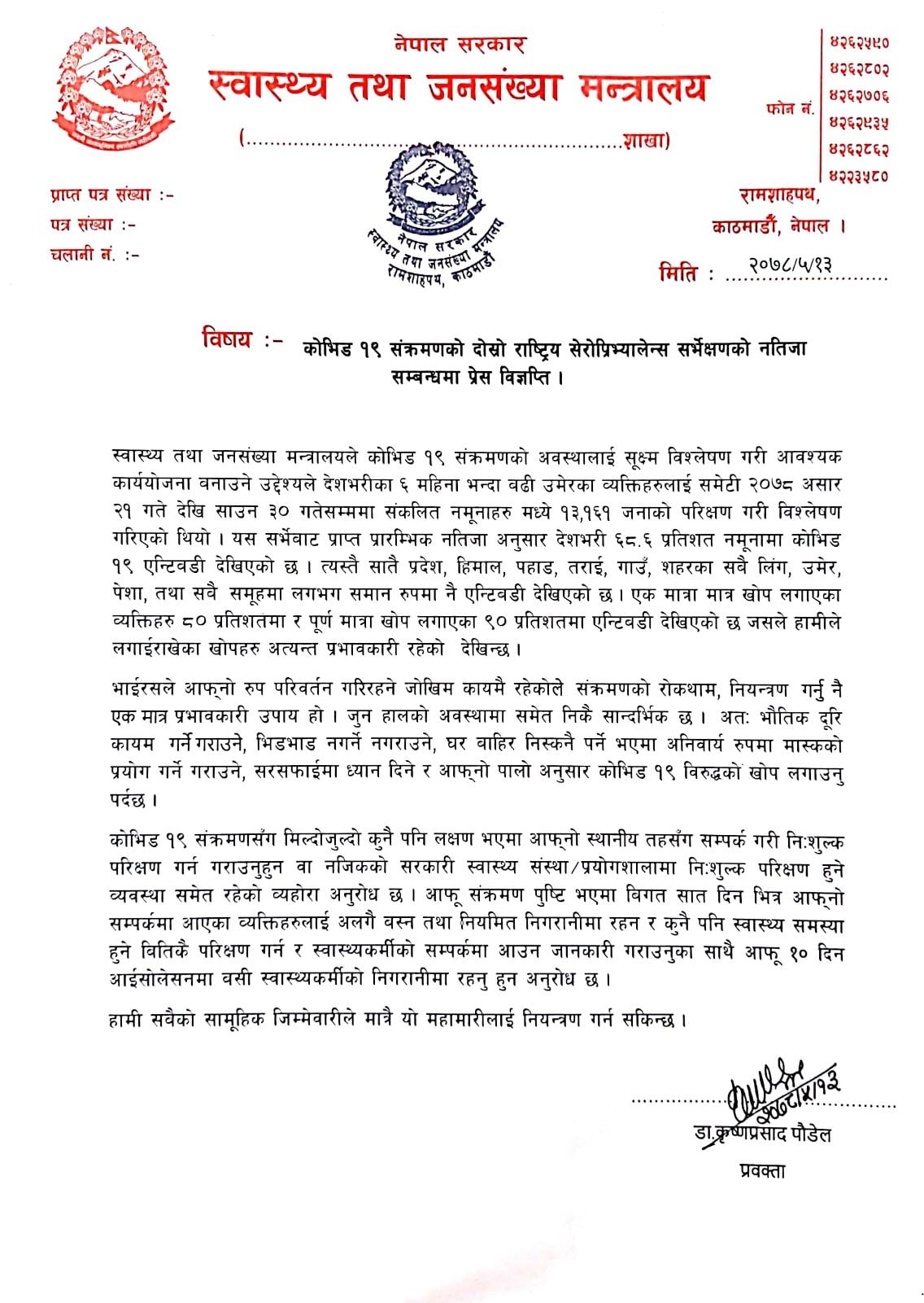 मन्त्रालयले असार २१ देखि साउन ३० सम्म १३ हजार १६१ नमूना संकलन गर्दा ६८.६प्रतिशत नमूनामा कोभिड–१९ एन्टीबडी देखिएको छ । जसमा एक मात्र खोप लगाएका व्यक्तिहरुमा ८० प्रतिशत र पूर्णमात्रा खोप लगाएकामा ९० प्रतिशत एन्टीबडी देखिएको छ । नमूना संकलन गर्दा सबै समूह र क्षेत्रलाई समेटिएको मन्त्रालयले जनाएको छ ।
