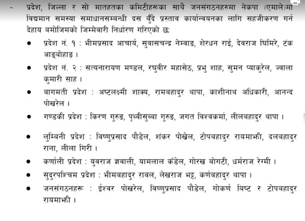 कर्णाली प्रदेशमा युवराज ज्ञवाली, यामलाल कँडेल, गोरख बोगटी, धर्मराज रेग्मीलाई १० बुँदे प्रस्ताव कार्यान्वयन गर्न जिम्मेवारी तोकिएको छ। सुदूरपश्चिम प्रदेशमा भीमबहादुर रावल, लेखराज भट्ट र कर्णबहादुर थापालाई १० बुँदे सहमति कार्यान्वयन गर्ने जिम्मेवारी तोकिएको छ।