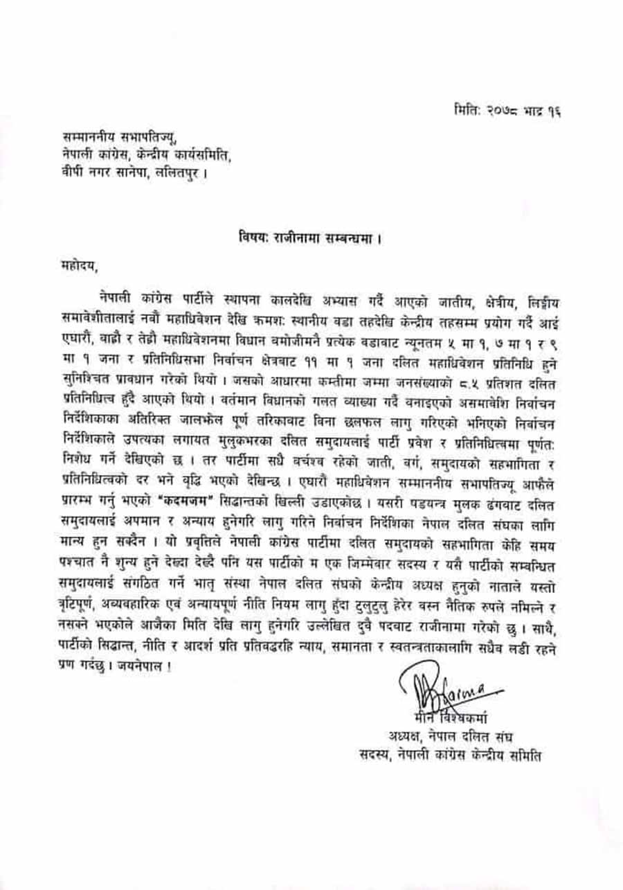 काठमाडौं । नेपाली कांग्रेसका केन्द्रीय सदस्य मीन विश्वकर्माले केन्द्रीय सदस्य र नेपाल दलित संघको अध्यक्ष समेतबाट राजीनामा दिएका छन् । विश्वकर्माले बुधबार विज्ञप्ति जारी गरी पार्टी सभापति शेरबहादुर देउवालाई सम्बोधन गर्दै लेखेको राजीनामा पत्रमा उनले निर्वाचन निर्देशिकाप्रति आपत्ति जनाएका छन् ।