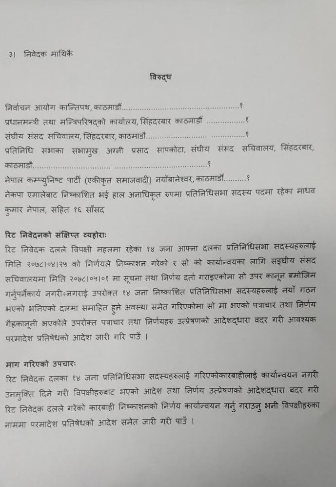एमाले अध्यक्ष ओलीले वारेसनामामार्फत बुधवार सर्वोच्चमा रिट निवेदन दर्ता गराएका हुन् । सो रिटमाथि आउँदो शुक्रबार प्रारम्भिक सुनुवाइ हुने भएको छ । एमाले केन्द्रीय कार्यालय सचिव शेरबहादुर तामाङले सांसद कारवाही सिफारिसमा रोकेर सभामुखले अधिकारको पालना नगरेकाले उक्त निर्णय विरुद्ध सर्वोच्चमा रिट निवेदन दिएको बताए । रिटमा कारवाही गरेर १४ सांसदलाई मान्यता दिएर दल दर्ता गरेको भन्दै निर्वाचन आयोगलाई पनि विपक्षी बनाइएको छ ।