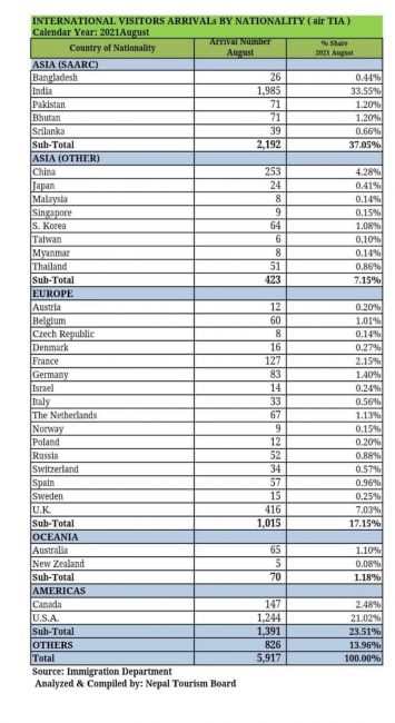 काठमाडौं। सन् २०२१ को अगस्ट महिनामा करिब ६ हजार विदेशी पर्यटक नेपाल भित्रिएका छन्। त्रिभुवन अन्तर्राष्ट्रिय विमानस्थल कार्यालय हुँदै सन् २०२१ को अगस्ट महिनामा ५ हजार ९ सय १७ विदेशी पर्यटन नेपाल भित्रिएको अध्यागमन विभागले जनाएको छ।